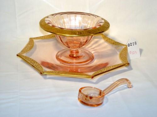 PINK DEPRESSION GLASS MAYONNAISE ON PLATE GILT EDGE