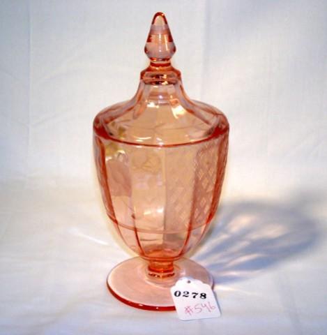 PINK ETCHED GLASS COVERED SWEET MEAT JAR