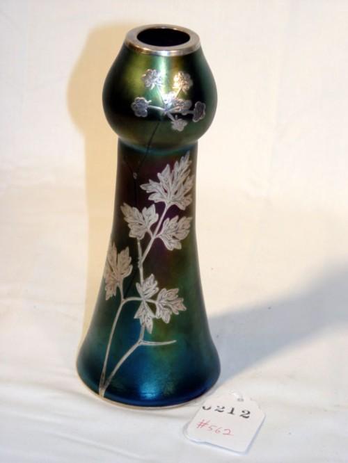 SILVER OVERLAY IRRIDESCENT ART GLASS VASE (SOME SILVER MISSING) 8.5"HIGH
