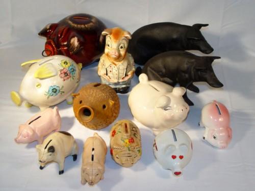 TRAY LOT PIGGY BANKS INCL METAL AND POTTERY
