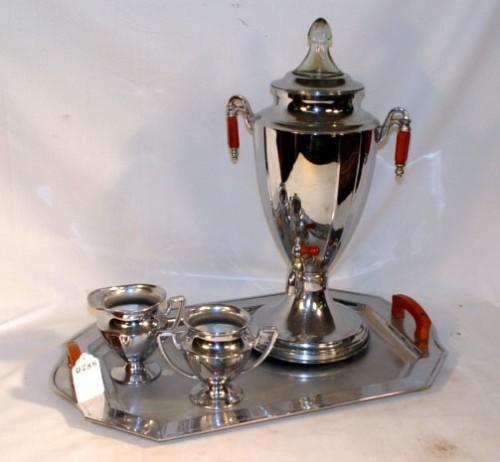 CHROME COFFEE SET ON TRAY W/ BAKELITE HANDLES