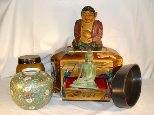 ORIENTAL JEWELRY BOX, FIGURINES, VASES, ETC.
