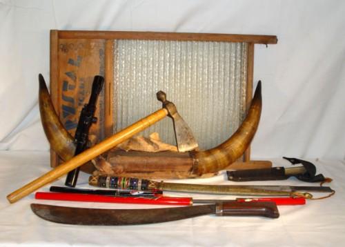BOX LOT WASHBOARD WITH TOMAHAWK, HORNS, ETC.