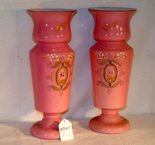 PAIR PINK ENAMEL DECORATED BRISTOL GLASS VASES