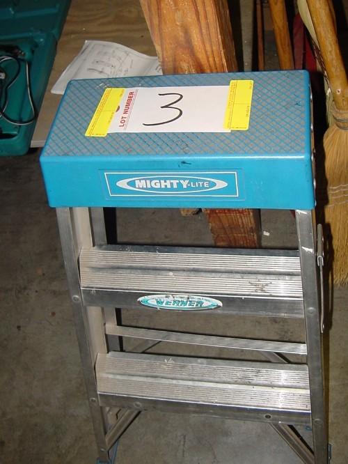 Lot 3 MISC. MOPS, MOP BUCKET, SET LADDERS, BROOMS AND FAN