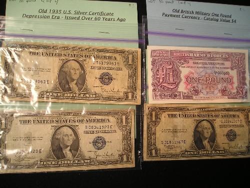 3 SILVER CERTIFICATES, ALL DATED 1935; BRITISH MILITARY ONE POUND NOTE FROM 1950'S