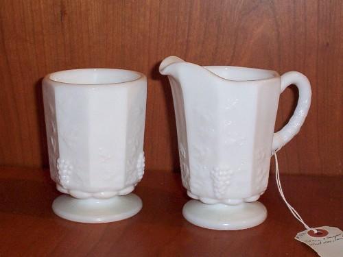 MILK GLASS CREAMER AND OPEN SUGAR," PANELED GRAPE'