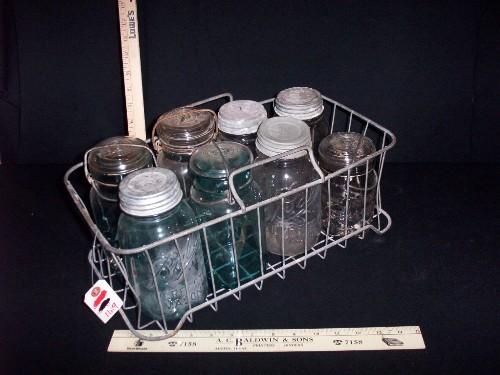 8 VINTAGE CANNING JARS WITH LIDS IN WIRE BASKET
