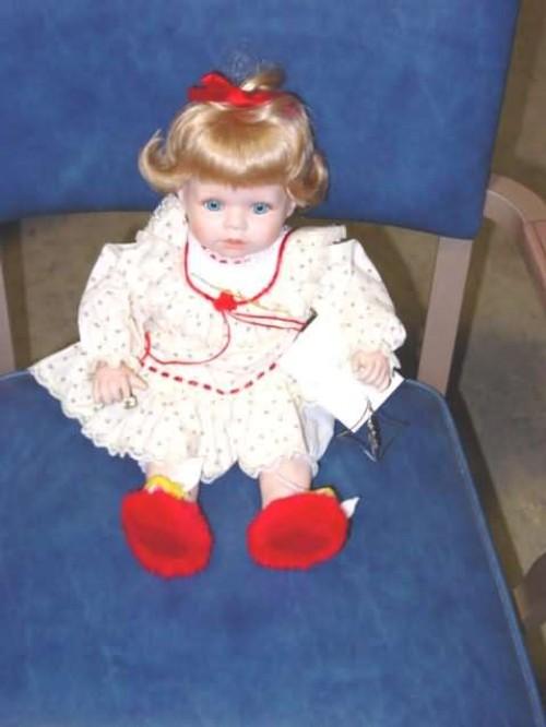 Baby's First Step Christmas artist Estelle Worrell Special Moments Collection 11.5" seated Porcelain & cloth