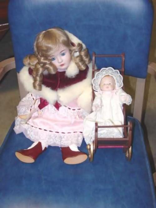Francie with Baby Doll & Carriage Bonnets & Bows Collection limited edition 17/1000 1988 2 doll set Francie is alll porcelain elastic is stretched 18.5", baby is 7.5" porcelain & cloth