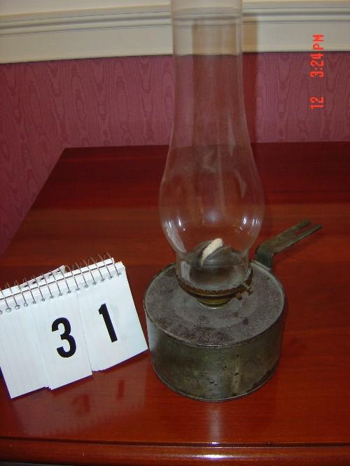 Lot 31 OIL LAMP - 14 1/4" TALL, METAL BASE 5 1/4", clear chimney