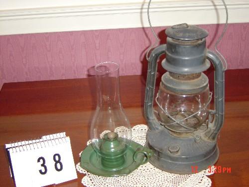 Lot 38 2 LANTERNS - (1) 11" TALL GREEN METAL WITH CLEAR GLOBE, AND (1) 13" TALL GRAY METAL HANGING LANTERN