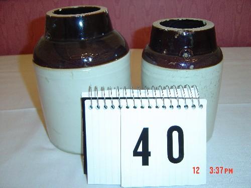 Lot 40 2 CROCKS - SMALL 7" AND MEDIUM 8" SIZES - WHITE BASE, BROWN TOPS