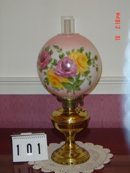 Lot 101 23" TALL BRASS OIL LAMP (ELECTRIFIED) WITH HAND PAINTED YELLOW AND PINK LARGE ROSES ON GLOBE