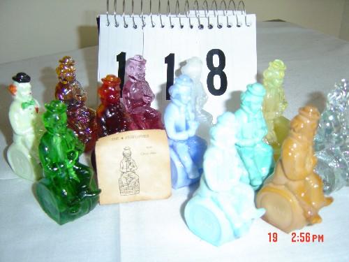 Lot 118 (13) CLOWNS ON BARRELS - ALL DIFFERENT COLORED GLASS - ALL MARKED (M) (1982) NAMED: ZIGGY, QUINN, PO