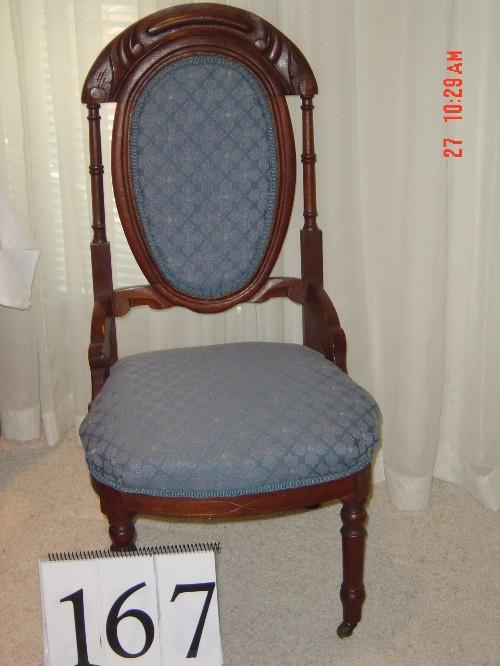 Lot 167 WALNUT GOTHIC SLIPPER CHAIR W/ CARVING AND BLUE VELVET UPHOLSTERY