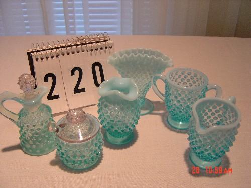 Lot 220 6 PIECES OF SMALL BLUE HOBNAIL ITEMS - 2-HANDLED SUGAR JAR; PITCHER; CRUET W/ STOPPER; CONDIMENT JAR