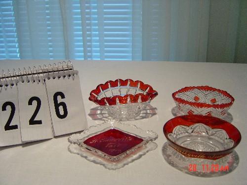 Lot 226 (4) RUBY & CLEAR PIECES - DIAGONAL DISH - "ST CLAIRSVILLE FAIR - 1917"; "SHELBYVILLE, IND" BOWL, FLU