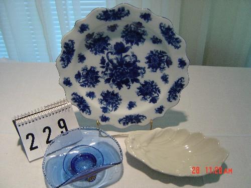 Lot 229 LARGE WHITE PORCELAIN SERVER WITH BLUE FLOWERS AND SCALLOPED EDGE, IRONSTONE FLEUR DE LIS, BLUE GLAS