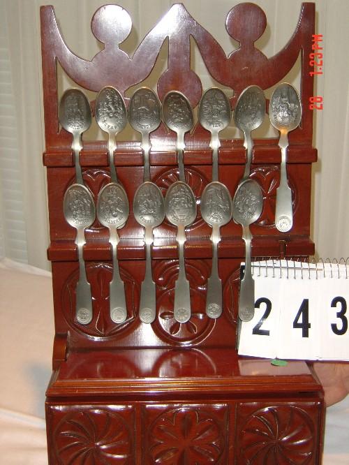 AMERICAN COLONIES SPOON COLLECTION - ON WOOD 2 TIER DISPLAY SHELF AND CARVED DRAWER (SPOONS FROM THE FRANKLIN MINT)