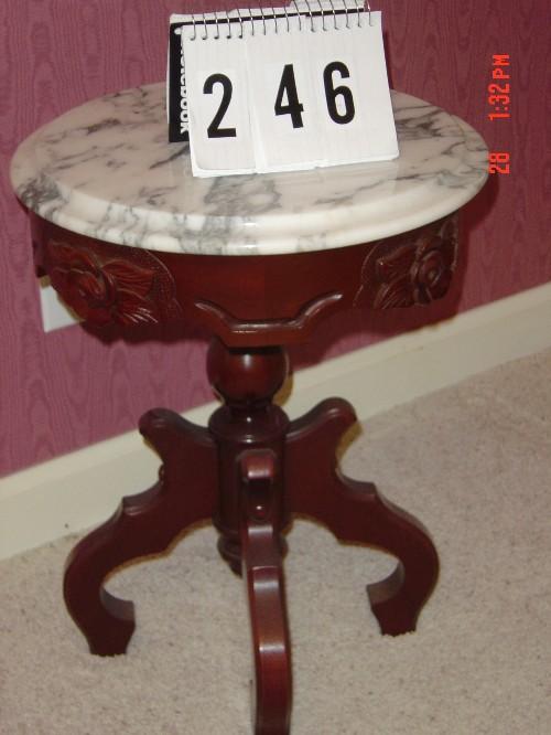 Lot 246 VICTORIAN STYLE LOW MARBLE TOP TABLE/STAND WITH CURVED FEET AND CARVINGS - 14" WIDE X 19" TALL