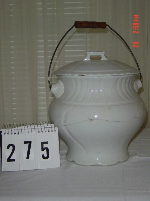 Lot 275 B.P. CO. IRONSTONE CHAMBER POT WITH LID AND WOOD HANDLE ON METAL - 12"