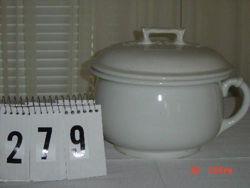 Lot 279 WARRANTED (ENGLISH) CHAMBER POT - WOOD DESIGN HANDLE ON LID, HANDLE ON SIDE - 7"
