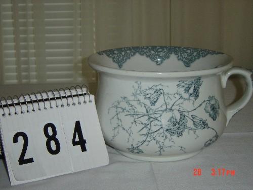 Lot 284 SEMI PORCELAIN CARLTON (ENGLAND) CHAMBER POT WITH GRAY LEAF DECAL AND SIDE HANDLE (NO LID)