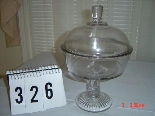 COMPOTE - plain, clear glass with lined foot, plain stem, large bowl and rounded lid with tall glass finial