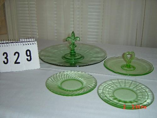 Lot 329 DEPRESSION GLASS - (4) pieces of green - Fleur de Lis sandwich plate, heart sandwich plate, (2) unma