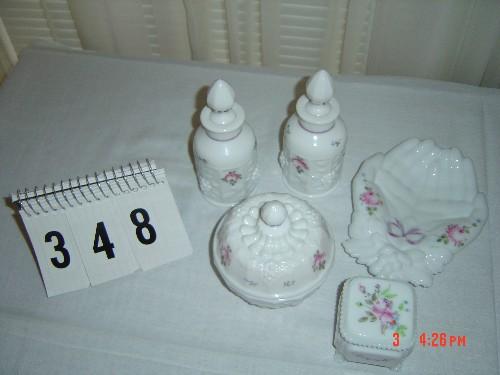 Lot 348 WHITE GLASS SET - powder box with lid, ring box with lid, open prayer hands soap dish, (2) bottles w