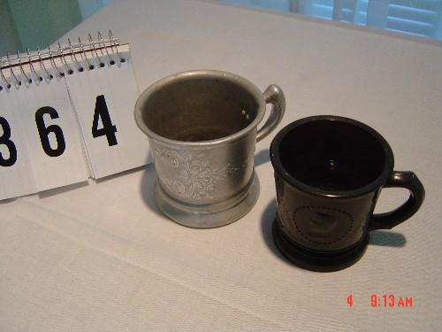 Lot 364 (1) BLACK PORCELAIN MUG, (1) TIN MUG with flower engraving