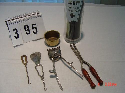 Lot 395 GROOMING ITEMS - old, small (non-electric) curling iron, shoe horn, clipper, MORVEY GERMICIDAL DISIN