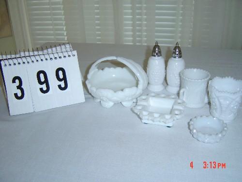 Lot 399 MILKGLASS - salt/pepper shakers, creamer & sugar, ashtray, master salt