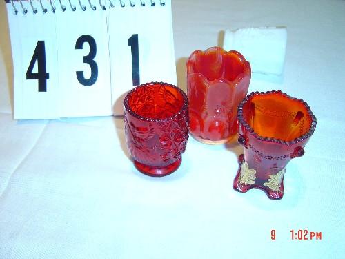 Lot 431 (3) TOOTHPICK HOLDERS - various colors of red, one with gold edge - one marked "B" inside a diamond