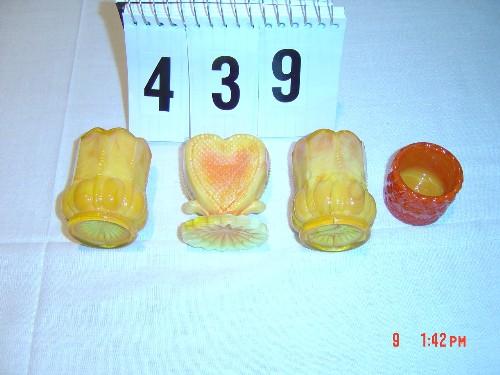 Lot 439 (3) TOOTHPICK HOLDERS - yellow mottled glass, (1) orange