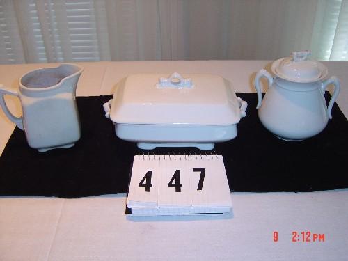 Lot 447 (3) PIECES OF IRONSTONE - Johnson Bros. 9 1/2" covered dish, England sugar & creamer