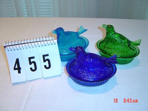 Lot 455 (3) DEGENHART blue & green GLASS BIRDS ON NESTS