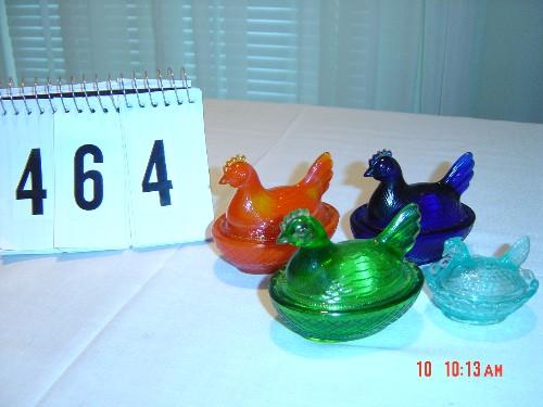 Lot 464 (4) PIECES OF DEGENHART - (1) cobalt small HEN on NEST, (1) red HEN on NEST, (1) green HEN on NEST,