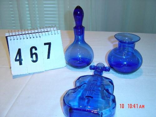 Lot 467 (3) COBALT GLASS PIECES - violin, small vase, bottle w/ stopper