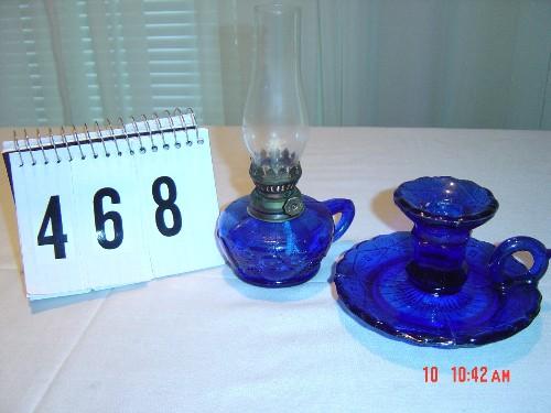 Lot 468 COBALT OIL LAMP, CANDLEHOLDER marked with "H" inside diamond