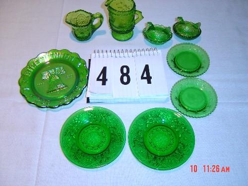 Lot 484 (9) PIECES OF GREEN GLASS - (5) souvenir plates, (2) small Hens on Nests, (2) small creamers