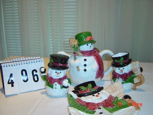 Lot 496 CHRISTMAS ITEMS - set of matching SNOWMAN teapot, cookie plate, creamer & sugar